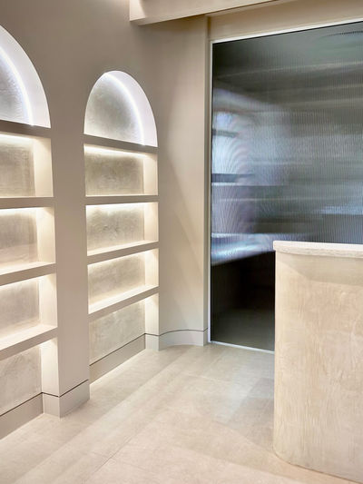 The design intent was to create a calming and luxurious environment that balances form and function. Soft archways, curved surfaces, and ambient lighting were introduced to bring fluidity and warmth into the space. A muted, textural palette of polished plaster, natural stone, warm timber, and fluted glass adds depth while maintaining a sense of understated elegance.